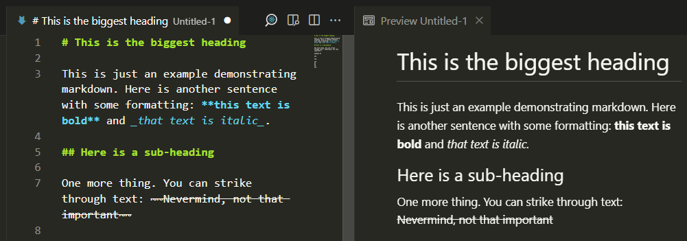 Similar to HTML, the idea is to write normal prose text and sprinkle in a few special characters so that the text is displayed in a separate view, formatted as bold, italic, or as a headline, etc. You can write it in a normal text editor, markdown editors or code editors like Visual Studio Code. The latter two usually have some kind of split-view where the markdown code can be seen in one panel next to the the formatted text in another one.